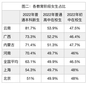 以雲南為例,2022年該省普通本科院校新生中女生佔比達到81.7%,相當於每錄取10名學生就有8名是女生。這一比例在31個省份(不含港、澳、台)中位居首位。