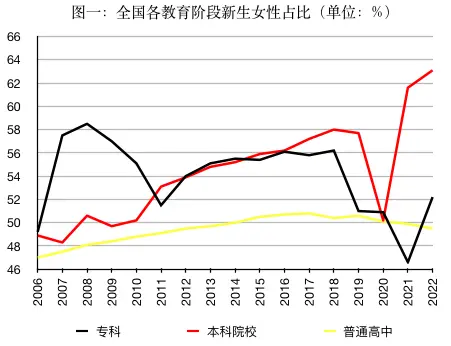2022年,河南普通本科錄取31.5萬人,其中女生為22.2萬人,佔比達70.4%;職業本科與專科共錄取48.5萬人,其中女生21.5萬人,佔比僅44.3%。