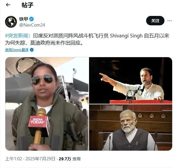 這位“希萬吉·辛格”,正是那位在5月印巴衝突期間被傳戰機遭到擊落的印軍女飛行員——她號稱是印度空軍“金箭中隊”中隊長,也是印度空軍首位女性“陣風”飛行員,疑似在衝突中被俘或已經陣亡,但相關傳聞均遭到印度否認。