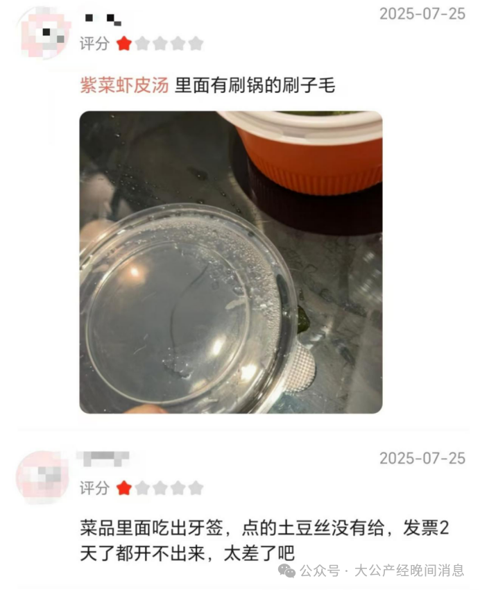 標榜“品質”的七鮮小廚,其餐品安全與服務卻令人擔憂。消費者反映購買的紫菜蝦皮湯中出現刷鍋的刷子毛,更有甚者從菜品中吃出牙籤。同時,還遭遇了土豆絲漏配、無法開具發票等問題。