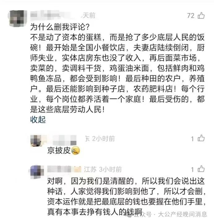 另有網友指出,京東外賣這一行為搶了底層人民的飯碗。“這會導致夫妻店陸續倒閉,廚師失業,實體店的房東也沒了收入,再後面菜市場, 賣菜的,賣調料乾貨,雞蛋油米麪,包括鮮肉和雞鴨魚凍品,都會受到影響。最後受傷的,都是這些底層勞動人民。”
