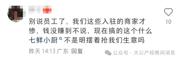 另有商家直言:“我們這些入駐商家才慘,錢沒賺到不説,現在搞的這個七鮮小廚不是明擺着搶我們生意嗎?”