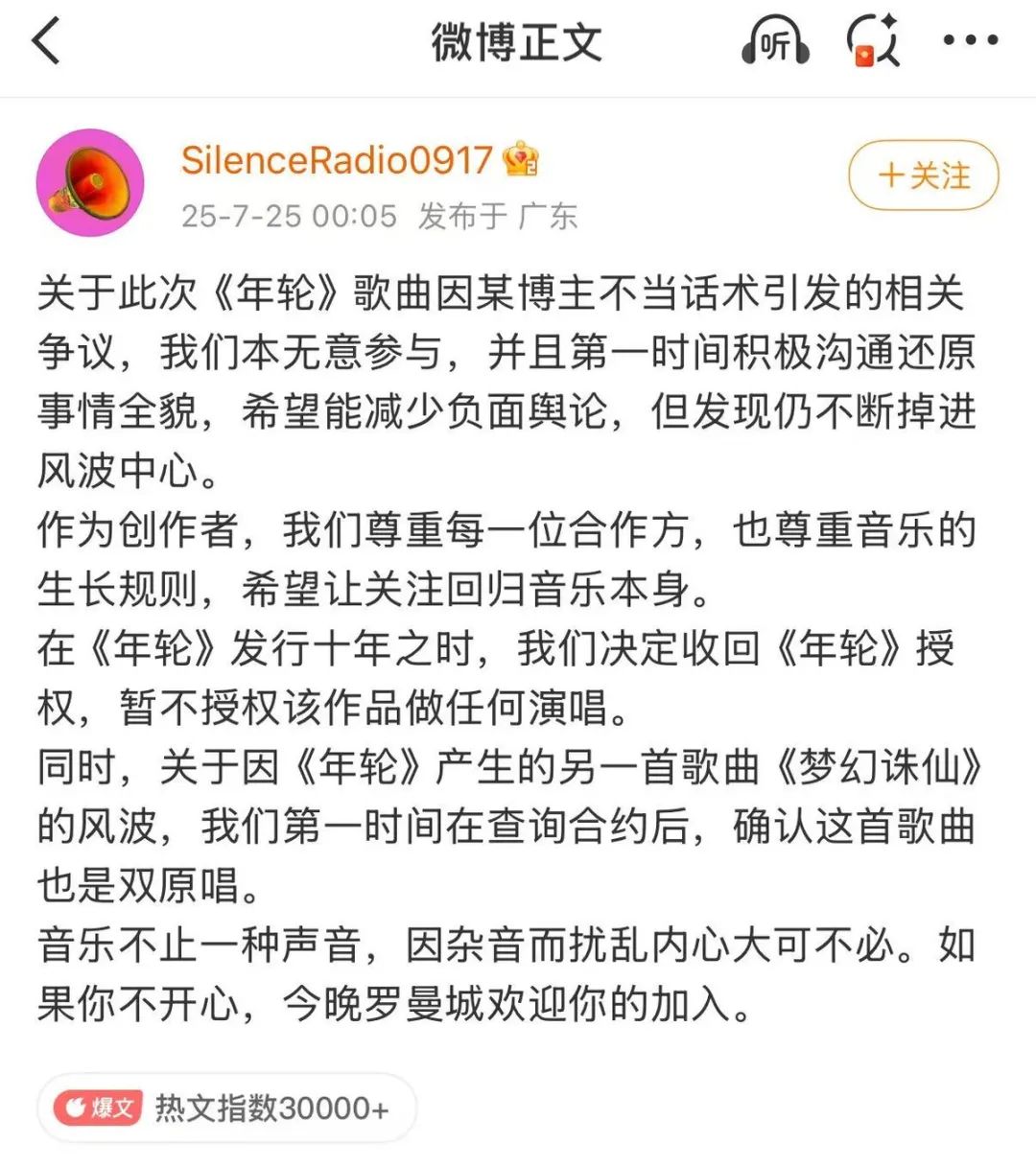 那邊,雙原唱各自的聲明卻引發了粉絲互攻的“雙輸”結果。汪蘇瀧工作室於7月25日凌晨發佈博文,表示“第一時間積極溝通還原事情全貌……但發現仍不斷掉進風波中心……決定收回《年輪》授權,暫不授權該作品做任何演唱”。隨後,張碧晨工作室發文稱:“張碧晨女士是《年輪》唯一原唱這一事實清晰明確,無可爭議。”並提及,“值此《年輪》發行十週年之際,好好和這首作品告個別。”