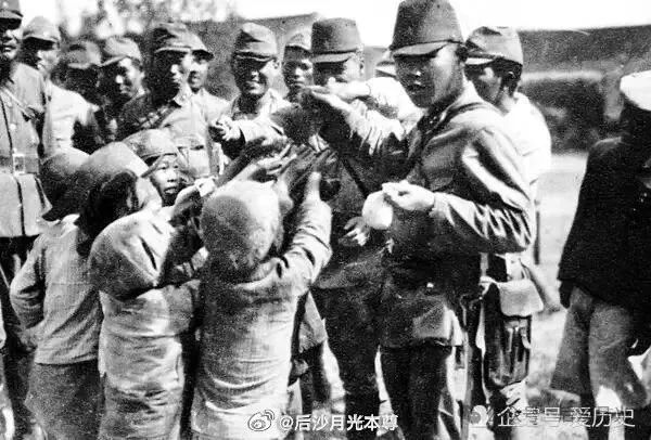 這是1939年2月,日軍登陸海南島的照片,鬼子在給孩子們發糖。