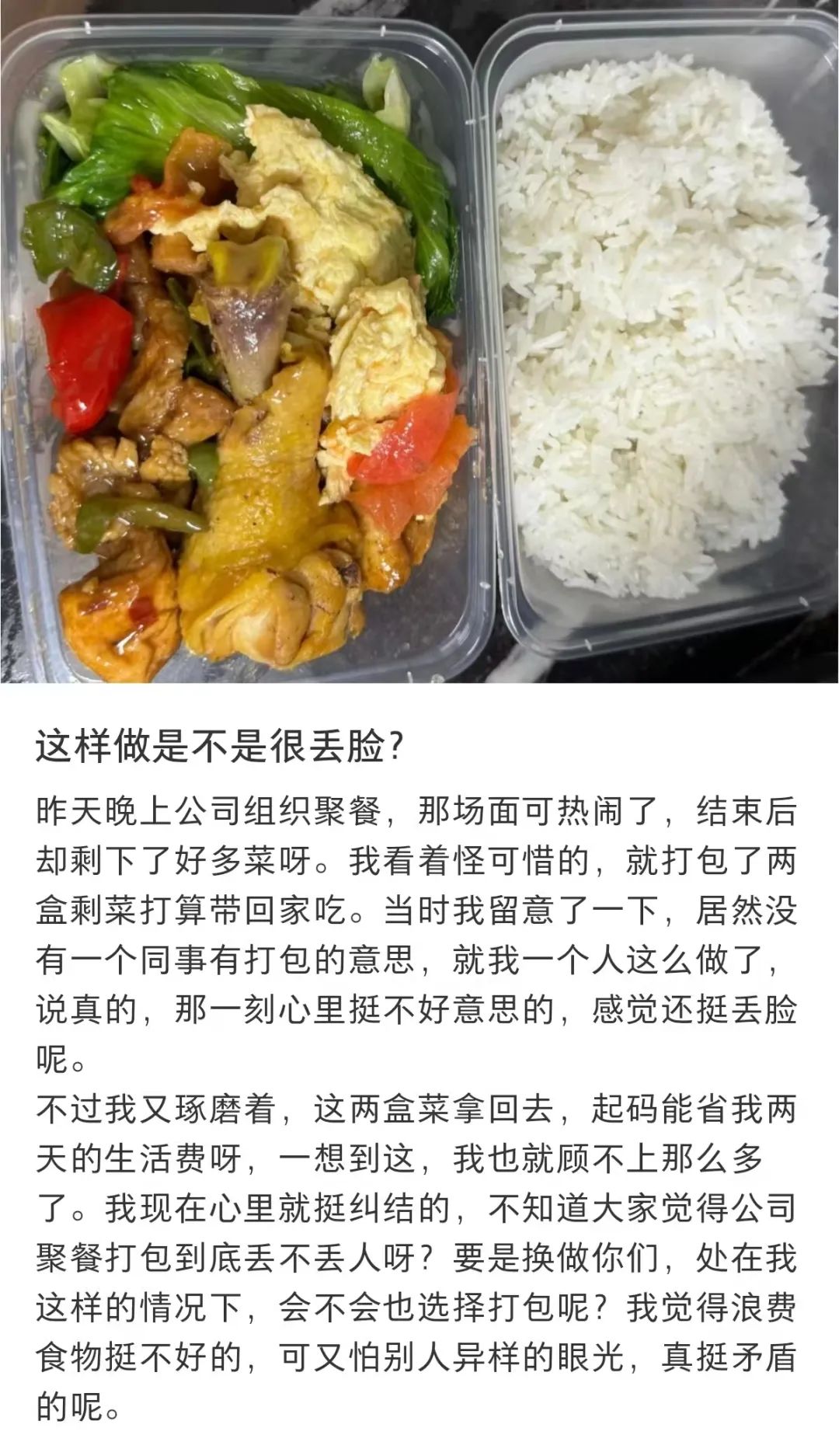 尤其是公司飯局、長輩場合、商務宴請,開口打包好像成了“掉價”的信號,彷彿一個塑料袋就能把你的形象從“體面人”拉成“摳門怪”。於是嘴上説着“太浪費了”,手卻老老實實放在膝蓋上,誰都不動筷子,誰都不動打包盒。