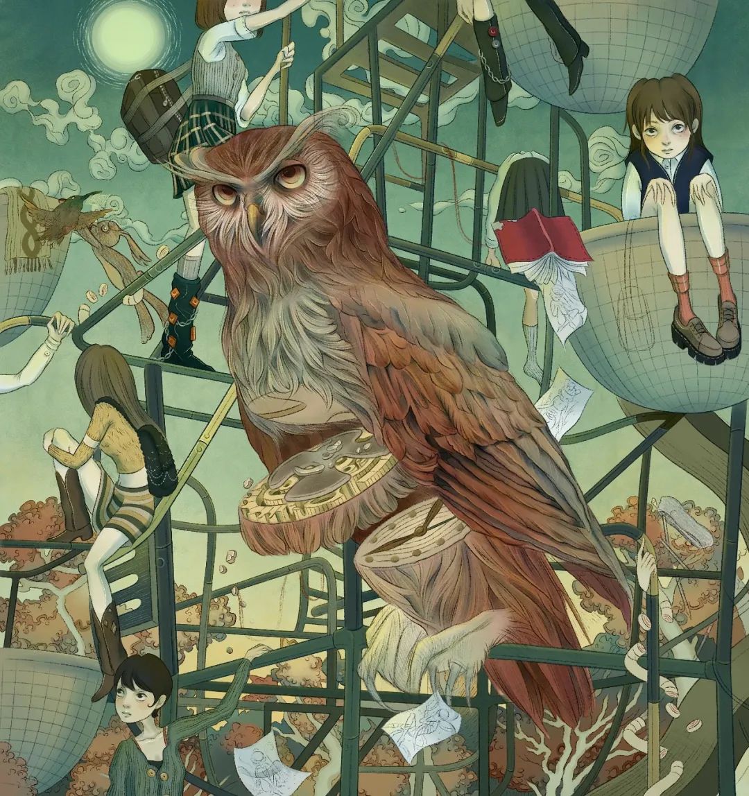 環繞在貓頭鷹周圍的,是幾個小女孩,有着揹着沉重的書包,有的埋頭在書本紙張裏,她們代表的是不同時間段的我。