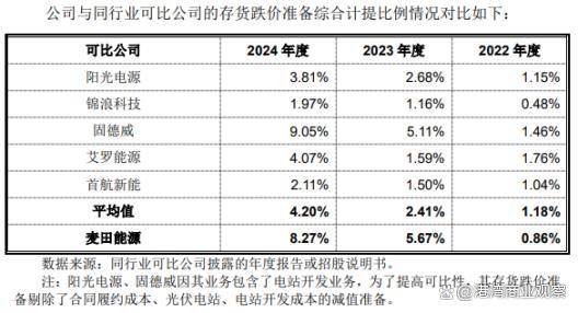 對此,麥田能源表示,公司温州工廠於2021年下半年開始逐步投產,存貨整體庫齡較短、狀態良好,故2022年末存貨跌價準備計提比例較低。2022年公司大量採購戰略原材料並提前進行產品備貨,但2023年下半年起因下游市場處於庫存去化階段,公司銷售規模有所下降,公司原材料、庫存商品未能按照預期完成消耗,公司存貨庫齡有所延長。基於謹慎性原則,2023年末、2024年末公司存貨跌價準備計提比例上升,與固德威較為接近,高於其他同行業可比公司。