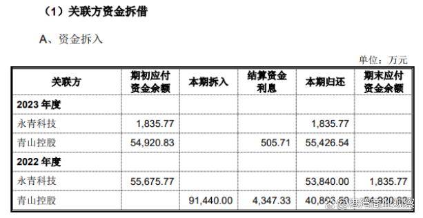 公司表示,與永青科技和青山控股的非經營性資金往來主要為拆借款,主要原因為公司發展前期資金實力有限,而生產採購、產品研發、日常運營等資金需求較大,存在一定資金缺口,因此發行人向永青科技和青山控股借款用於資金週轉。