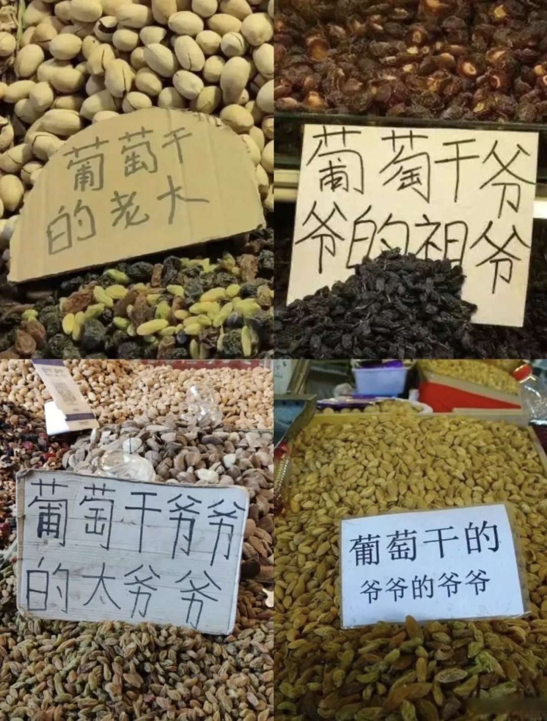也有人認為“葡萄的爺爺”是曬得較“老”的種類,而“葡萄乾的孫子”則是新曬制的“年輕葡萄”。