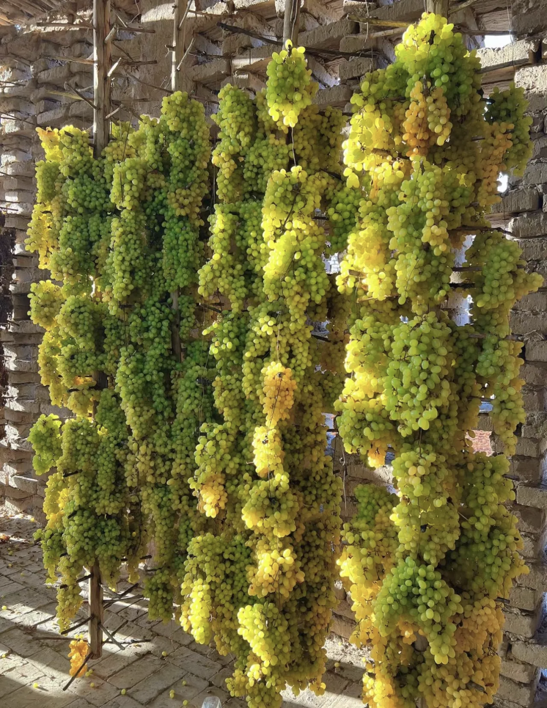 在吐魯番火焰山下的村落間,一座座土坯砌成的方形建築星羅棋佈。四壁鏤空如蜂巢,走近看,一串串翡翠般的葡萄從木架垂落,乾熱風穿牆而過,空氣中瀰漫着蜜糖般的芬芳。