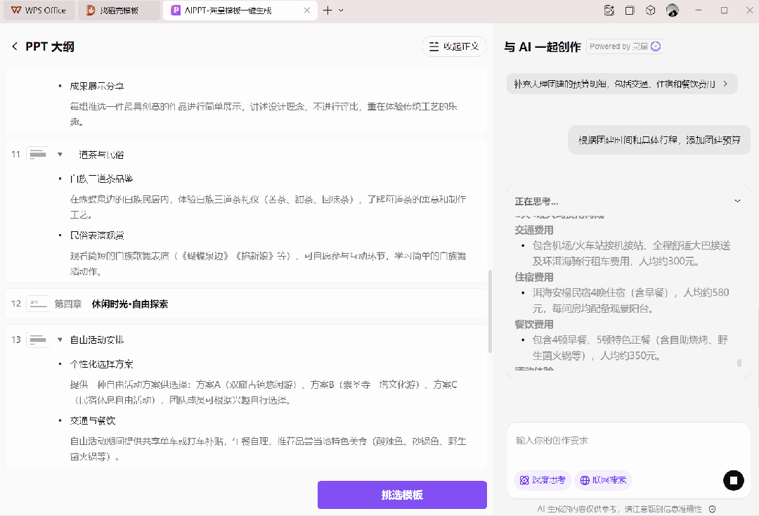 再讓WPS靈犀根據團建時間和具體行程,添加團建預算。