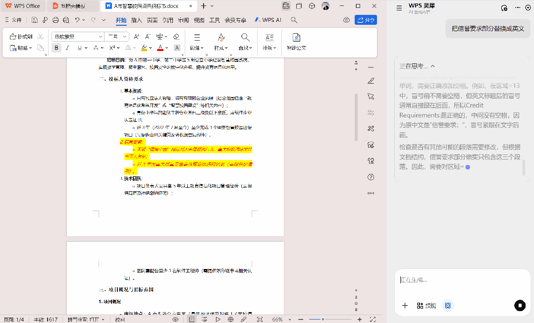 再然後,把信譽要求那個部分做了高亮、換顏色和傾斜處理,讓WPS靈犀把內容替換成英文。
