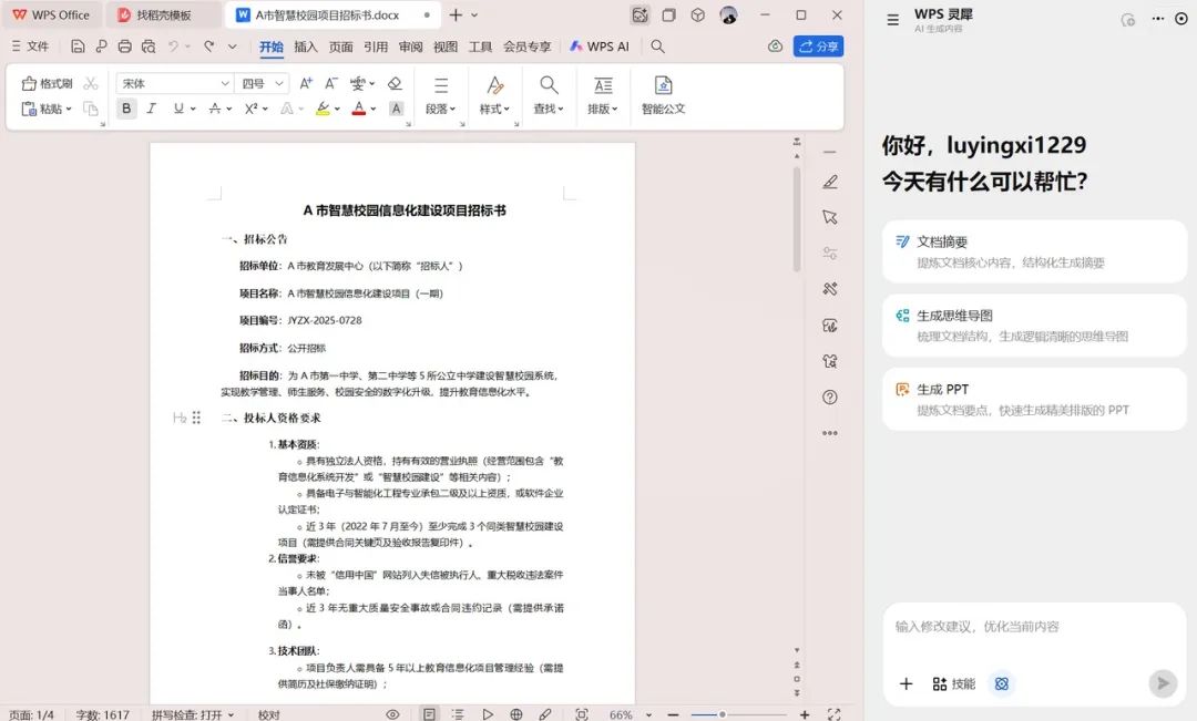 我先讓WPS靈犀幫我生成了一份項目招標書,文本、格式都安排得明明白白。
