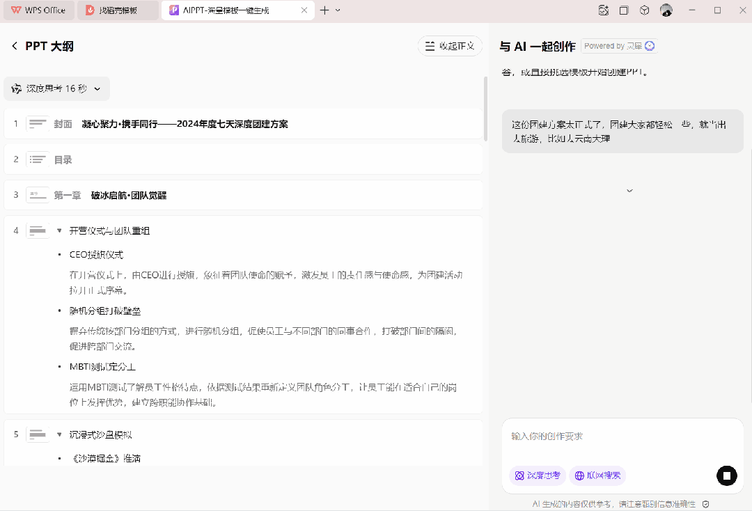 差評君讓WPS靈犀做了一份,差評年度團建計劃的PPT。初版大綱沒法兒直接用,但問題不大,咱們可以在右邊對話框裏一直改。