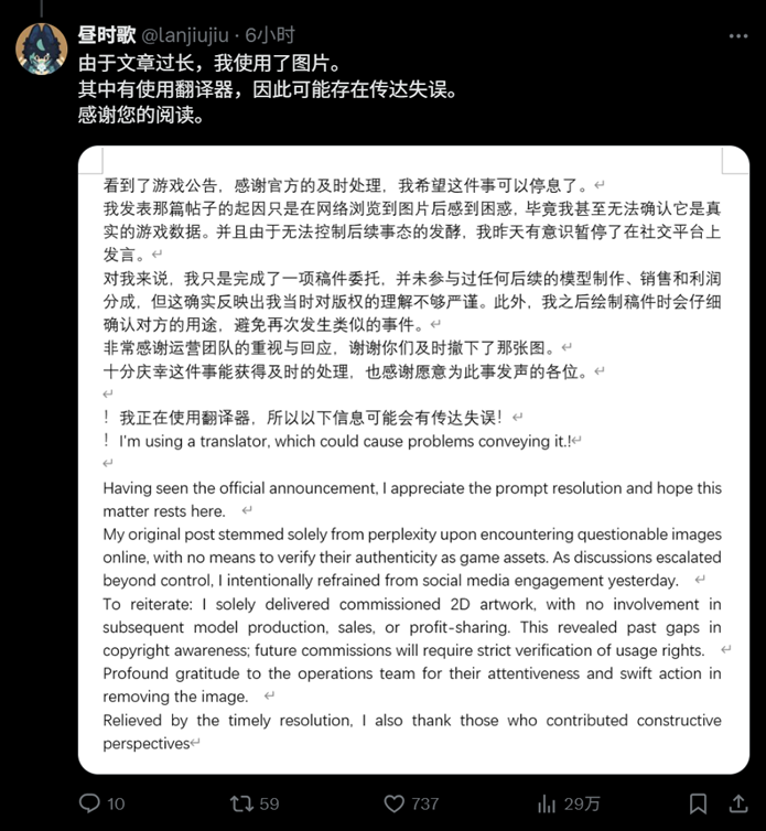 隨後晝時歌承認,這幅畫一開始就是受這家模型廠委託而收費繪製的。換言之,在這件事中,晝時歌本身也涉及模型廠對寶可夢官方的侵權。她也在今天表示認可官方的處理方式,希望這件事可以停息了。
