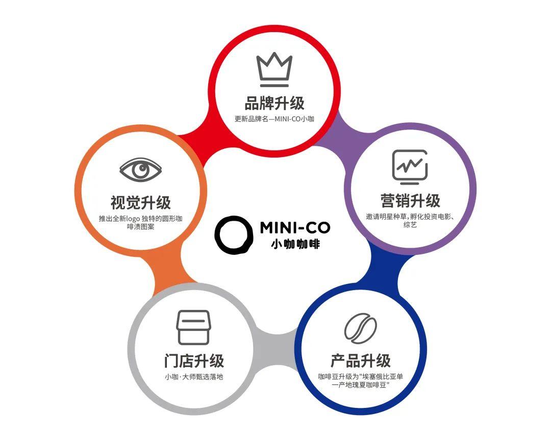 作為品牌升級的核心動作,今年3月,其更新了品牌名——MINI-CO小咖,並推出了全新的品牌logo,一款獨特的圓形咖啡漬圖案。