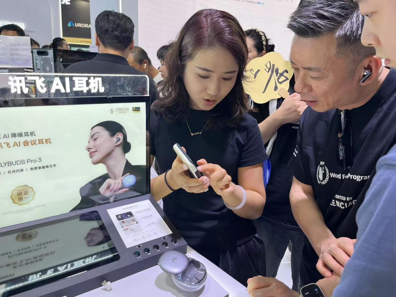 相較通過表演吸睛的具身機器人,未來智能展出的【訊飛AI會議耳機】Pro3與Air2則以具象實用的AI功能吸引了眾多專業人士駐足體驗。