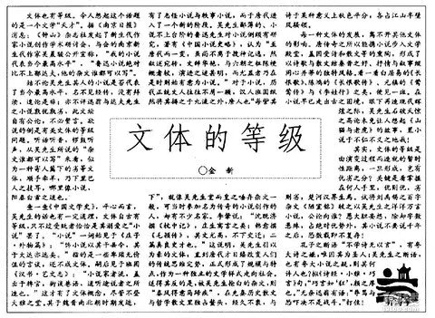 不論吳先生其人的小説是否代表了當今最高水平,名不見經傳,沒有拜讀,遑論是非;亦不評迅翁與達夫先生之小説孰優孰劣,此文壇自有公論,不必贅言。欲渾點迷津的倒是有關文體的等級問題。聽話聽音,鑼鼓聽聲,從吳先生所説的“雜文誰都可以寫”來看,似為一種寄人籬下的劣等文體,順手牽羊,乃下里巴人之技耳,哪裏像小説,陽春白雪之道也。