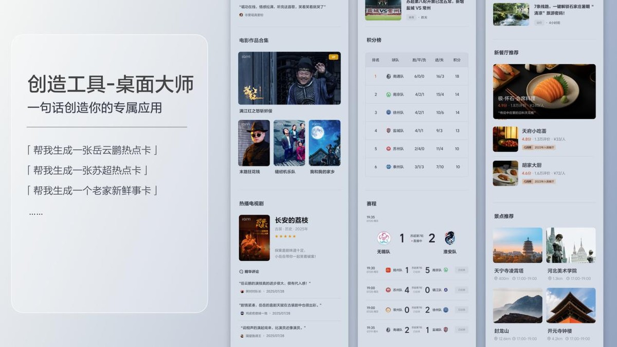 此外,理想同學全新升級“桌面大師”功能,這是車載行業首款AI代碼生成工具。升級後的理想同學智能體不僅能夠智能調用車內工具,還可以根據用户的需求自主創造內容和功能服務來完成複雜任務,只需要用户一句話,理想同學智能體就能夠自主生成個性化的桌面卡片。桌面大師初期的能力主要覆蓋在資訊、新聞、車控管理和小遊戲等方面,未來也將持續成長進化,為用户帶來更加靈活豐富的智能座艙體驗。
