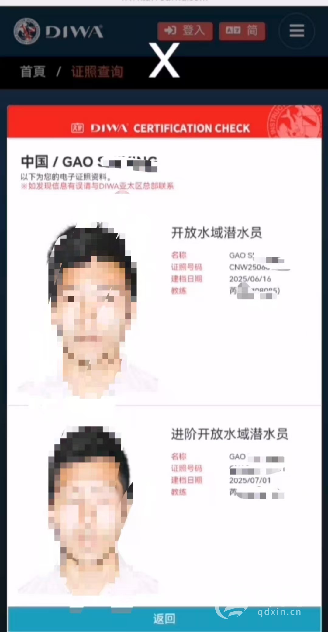 在DIWA官方網址中查詢到的合格證。(來源:受訪者)信網7月31日訊 7月7日,高先生拿到了自己期待已久的潛水證,證件上的OPEN WATER DIVER代表着開放水域潛水員。有了潛水證本來是個好事,但高先生也隱隱有些擔心:“我就在游泳館裏學了兩天,一天能有兩三個小時在水裏,就能拿證了?”對此培訓機構負責人稱:“開放水域的練習都得是先拿到潛水證,再由教練帶着下海練習的。”
