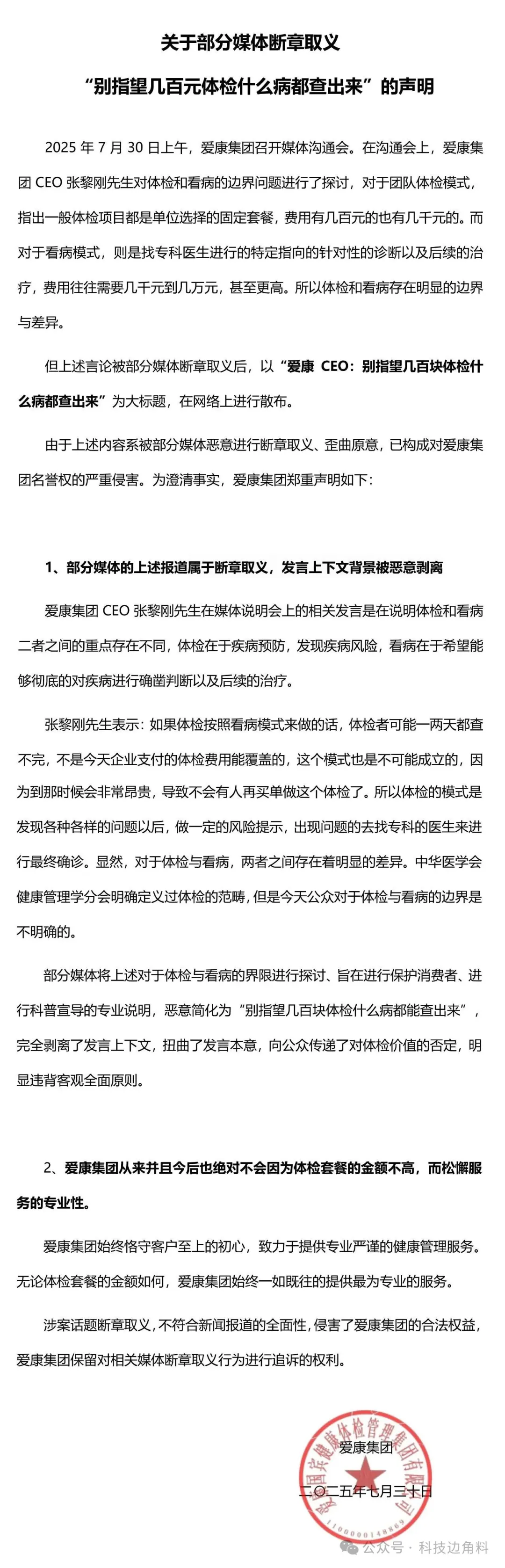 作為愛康國賓創始人,張黎剛在應對客户投訴的新聞發佈會上雖話糙理不糙,但他把體檢服務跟價格直接掛鈎,容易製造百姓體檢貴的焦慮,刺痛到了不少人的敏感神經,再加上媒體的推波助瀾,很快形成了輿論風暴。