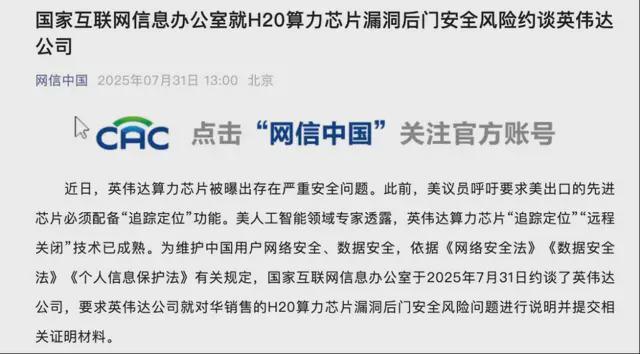 為維護中國用户網絡安全、數據安全,依據《網絡安全法》《數據安全法》《個人信息保護法》有關規定,國家互聯網信息辦公室於2025年7月31日約談了英偉達公司,要求英偉達公司就對華銷售的H20算力芯片漏洞後門安全風險問題進行説明並提交相關證明材料。