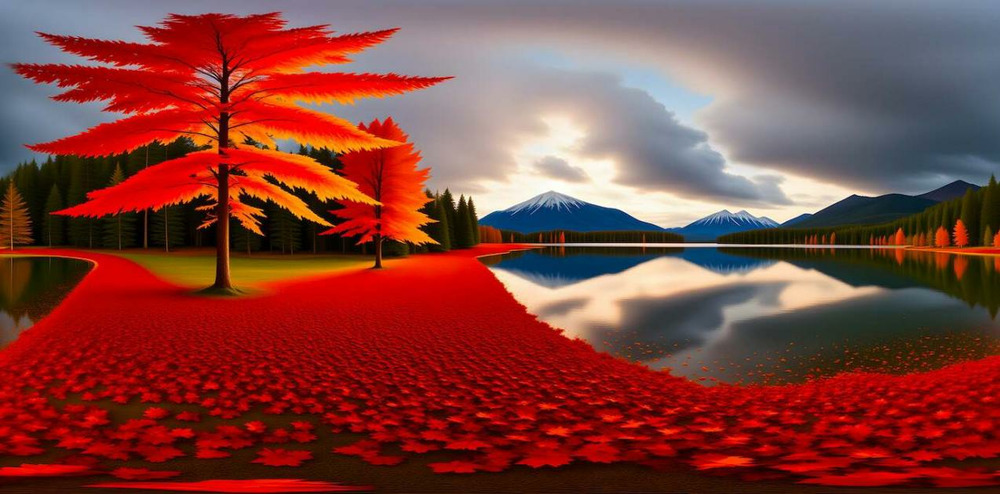 若輸入「金紅色的楓葉飄落在鏡面般的湖水上,倒映着遠處的雪山」,一張包括雪山、湖水、楓葉元素的效果圖就出來了: