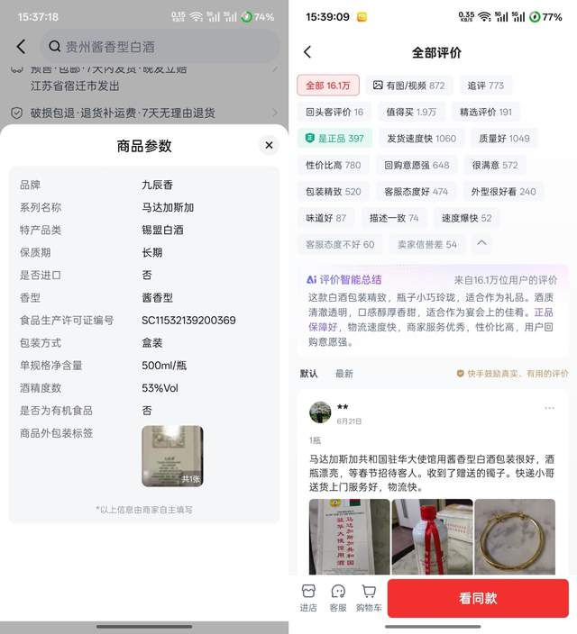 此外評論區顯示有16.1萬評論,但是實際評論不到3萬條,AI總結這款白酒包裝精緻,瓶子小巧玲瓏,適合作為禮品。酒質清澈透明,口感醇厚香甜,適合作為宴會上的佳餚。正品保障好,物流速度快,商家服務優秀,性價比高,用户回購意願強。