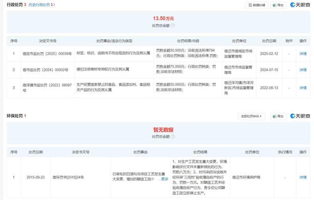 可以看到這家公司受過3項行政處罰及1項環保處罰,其中行政處罰包括標籤、標識、説明書不符合規定的行為及其從屬;侵犯註冊商標專用權行為及其從屬;生產經營國家禁止的食品、食品添加劑、食品相關產品的行為及其從屬。