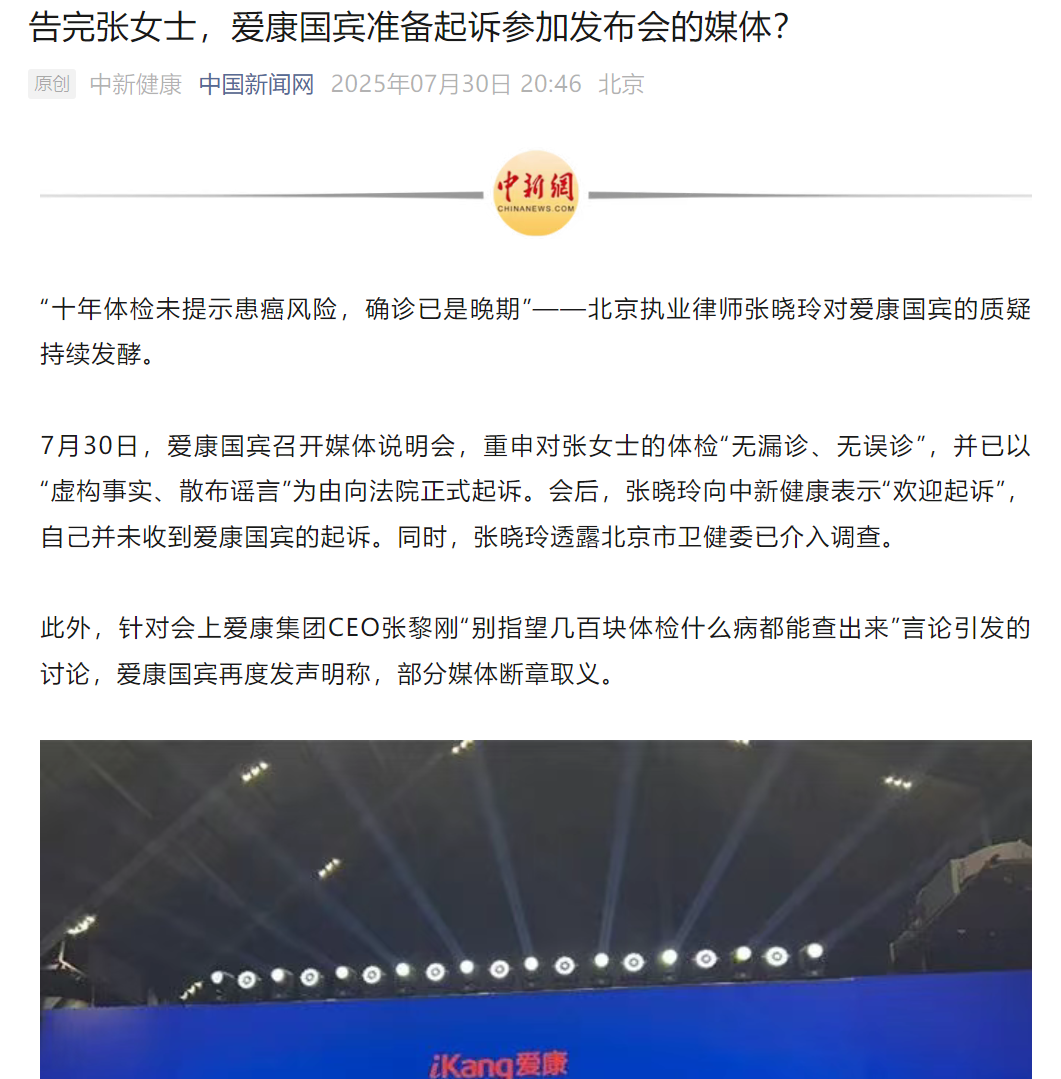 對於愛康國賓的聲明,顯然有的媒體並不認同,中國新聞網直接發文《告完張女士,愛康國賓準備起訴參加發佈會的媒體?》,不知道愛康國賓CEO和公關看到這個標題會作何感想?