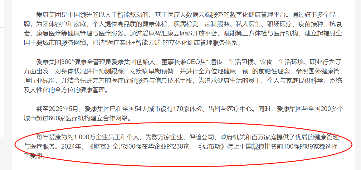 值接Talk在愛康國賓的官網查詢看到,愛康國賓稱每年愛康為約1000萬企業員工和個人,為數萬家企業、保險公司、政府機關和百萬家庭提供了優質的健康管理與醫療服務。2024年,《財富》全球500強在華企業的230家,《福布斯》榜上中國規模排名前100強的89家都選擇了愛康。
