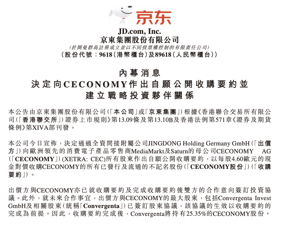 7月31日,京東發佈公告稱,決定通過全資間接附屬公司JINGDONG Holding Germany GmbH向歐洲消費電子產品零售商MediaMarkt及Saturn的母公司CECONOMY AG所有股東作出自願公開收購要約,以每股4.60歐元的現金對價收購CECONOMY的所有已發行及流通的不記名股份,並建立戰略投資夥伴關係。