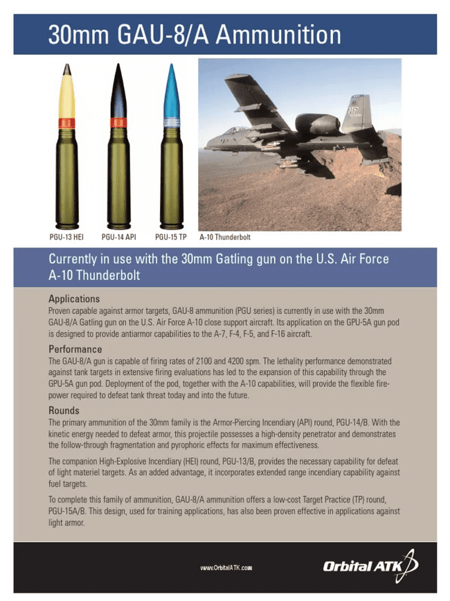 GAU-8這門30毫米的加特林機炮,在常規情況下的射速可以達到每分鐘3900發。在實際作戰中,地勤人員經常把它的射速調整為2100發每分鐘,這樣可以延長槍管的壽命。它的標準載彈量只有1174發,1358發就是滿載狀態,但通常不會帶太多,目的是減輕重量。在彈種的選擇上,可以選擇含有貧鈾材料製作彈芯的PGU-14反裝甲燃燒彈,也可以選擇專門用於對服務步兵的PGU-13高爆燃燒彈。
