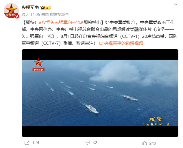 中國人民解放軍建軍98週年之際,中央廣播電視總枱、“中國軍號”等融媒體平台先後上線了《攻堅——矢志強軍向一流》的先導預告片。