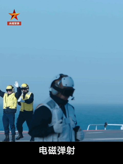 第三個鏡頭則是由彈射集控站下達“二號位允許起飛”的口令,還特地給了一個彈射器操作員按下彈射起飛按鈕的鏡頭,但是緊接着——嘿,並沒有殲-15T型艦載機彈射起飛的畫面,只是給了一個巨大的艦載機陰影掠過“福建”號飛行甲板的特寫。