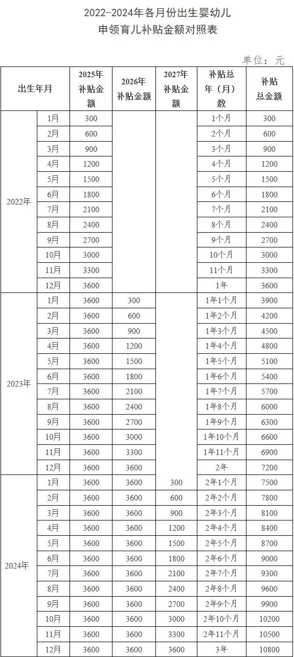 2022-2024年各月份出生嬰幼兒申領育兒補貼金額對照表(圖源:中國政府網)