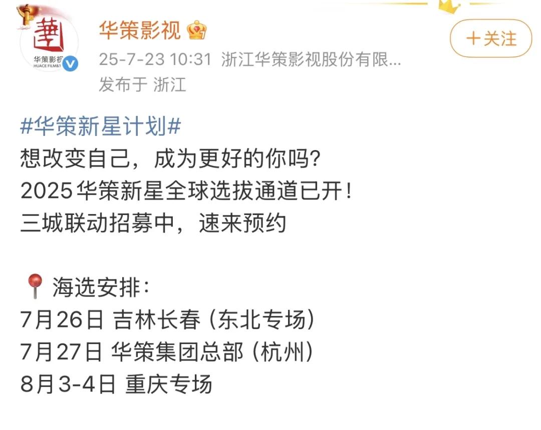 華策則是走起了“產學一體”的藝人培養道路。公司在今年啓動的 “華策新星計劃” ,面向全球招募14-24歲潛力學員,宣傳中強調是“文憑+練習生”的模式,優秀學員可直接進入華策龐大的影視項目池;經過三年系統培養並通過考核者,則簽約專屬的“未來星經紀中心”,實現從訓練、實踐到正式出道的全鏈路閉環。