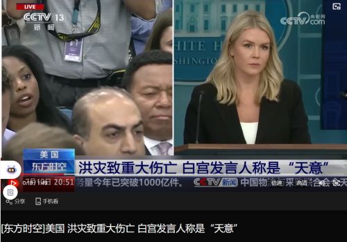 7月初美國某地發生了洪災,央視進行了報道,標題直接這麼寫,白宮發言人稱是“天意”。
