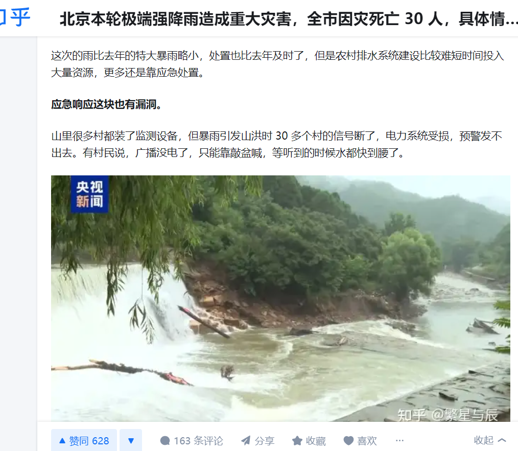 總而言之,就是北方地區大暴雨超過了本地人幾十年生活的經驗,他們想象不出有這麼大水災。