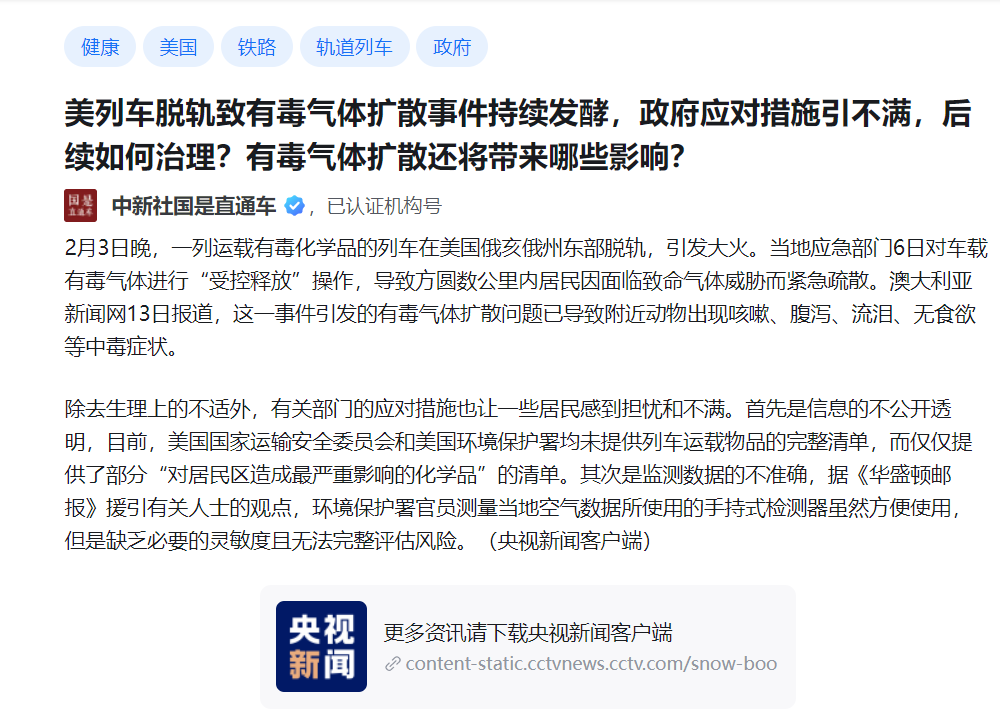 比如去年美國俄亥俄州列車脱軌,導致有毒氣體擴散,當時也轟動一時,網上有很多討論…