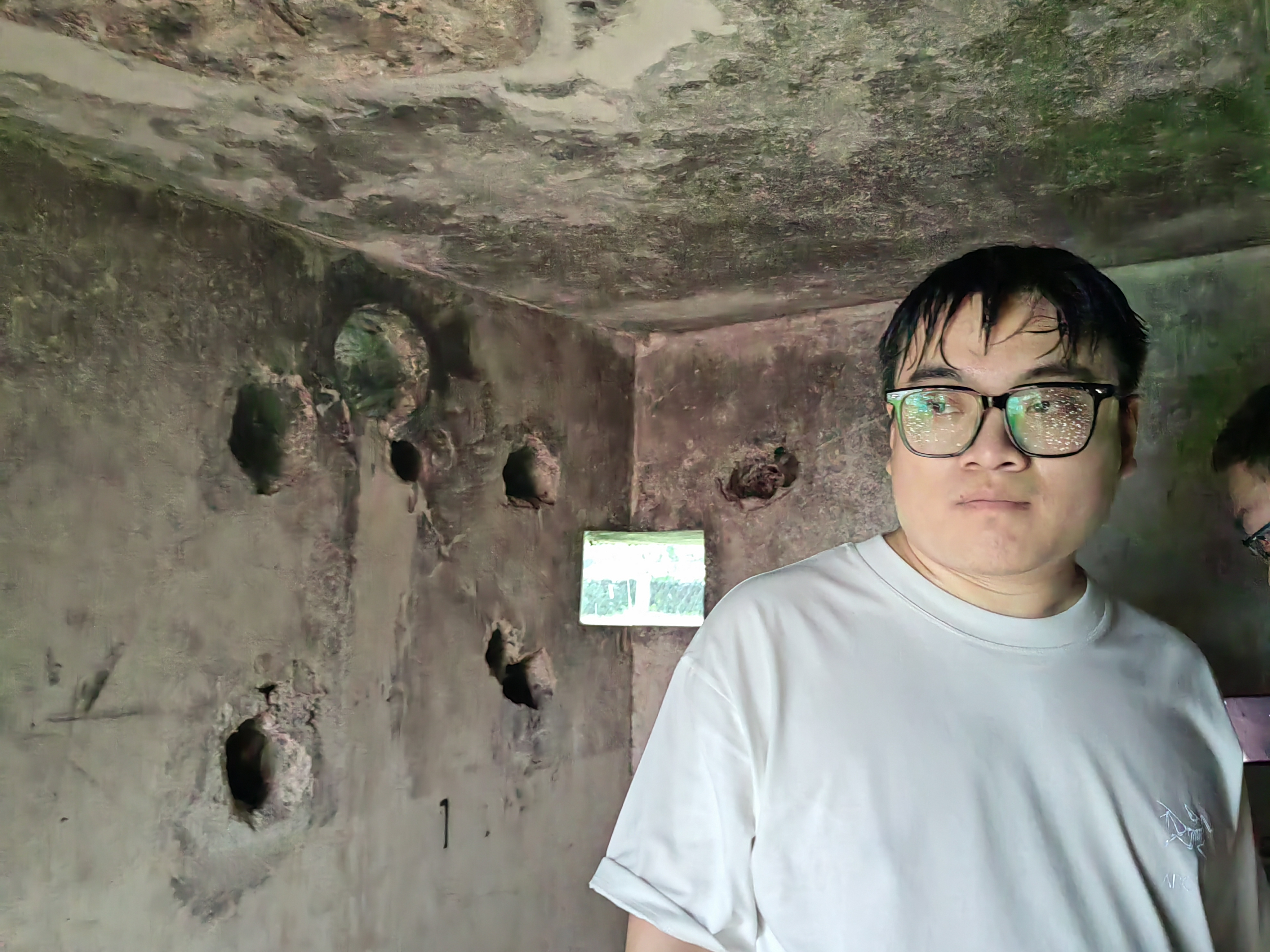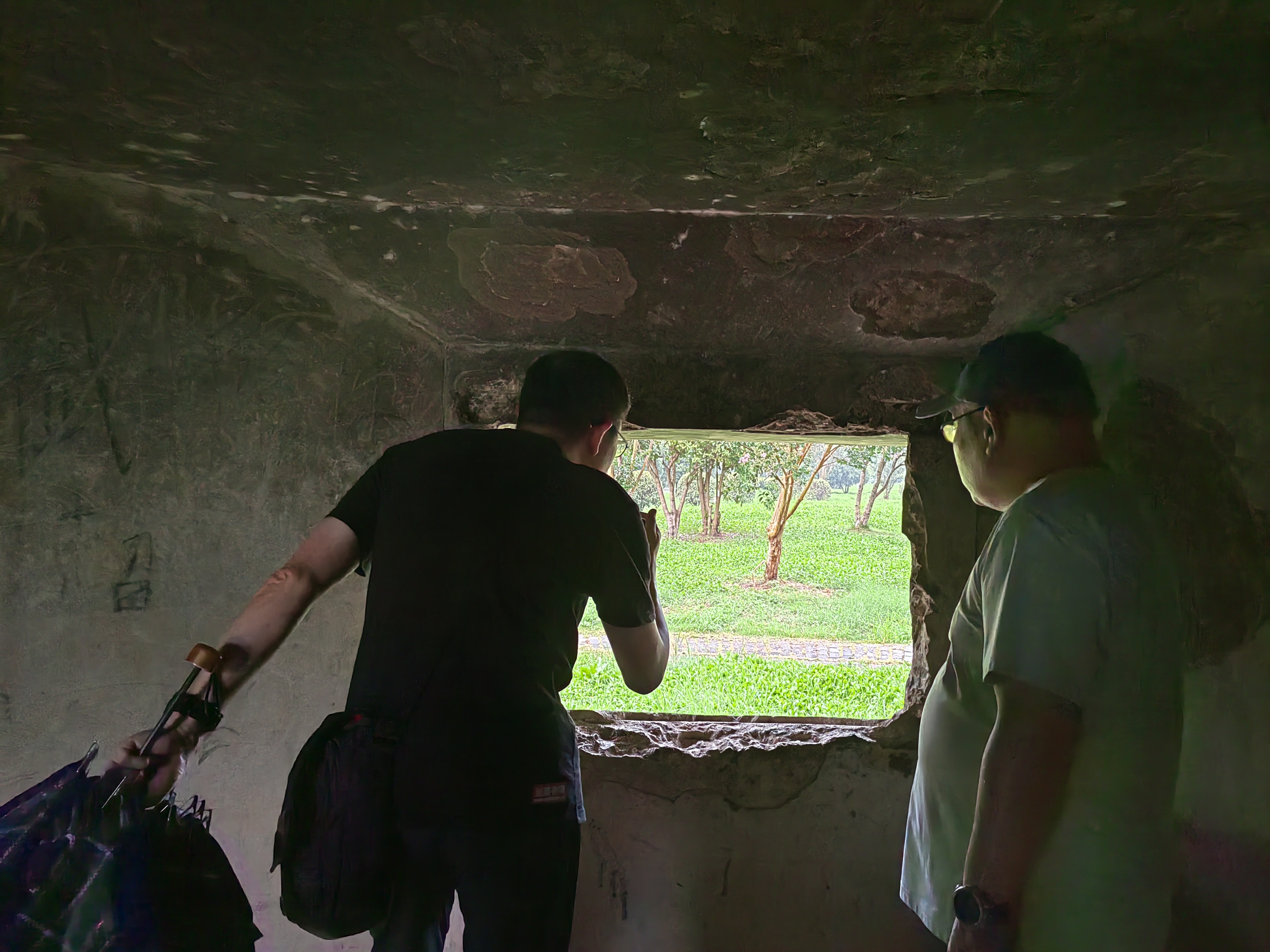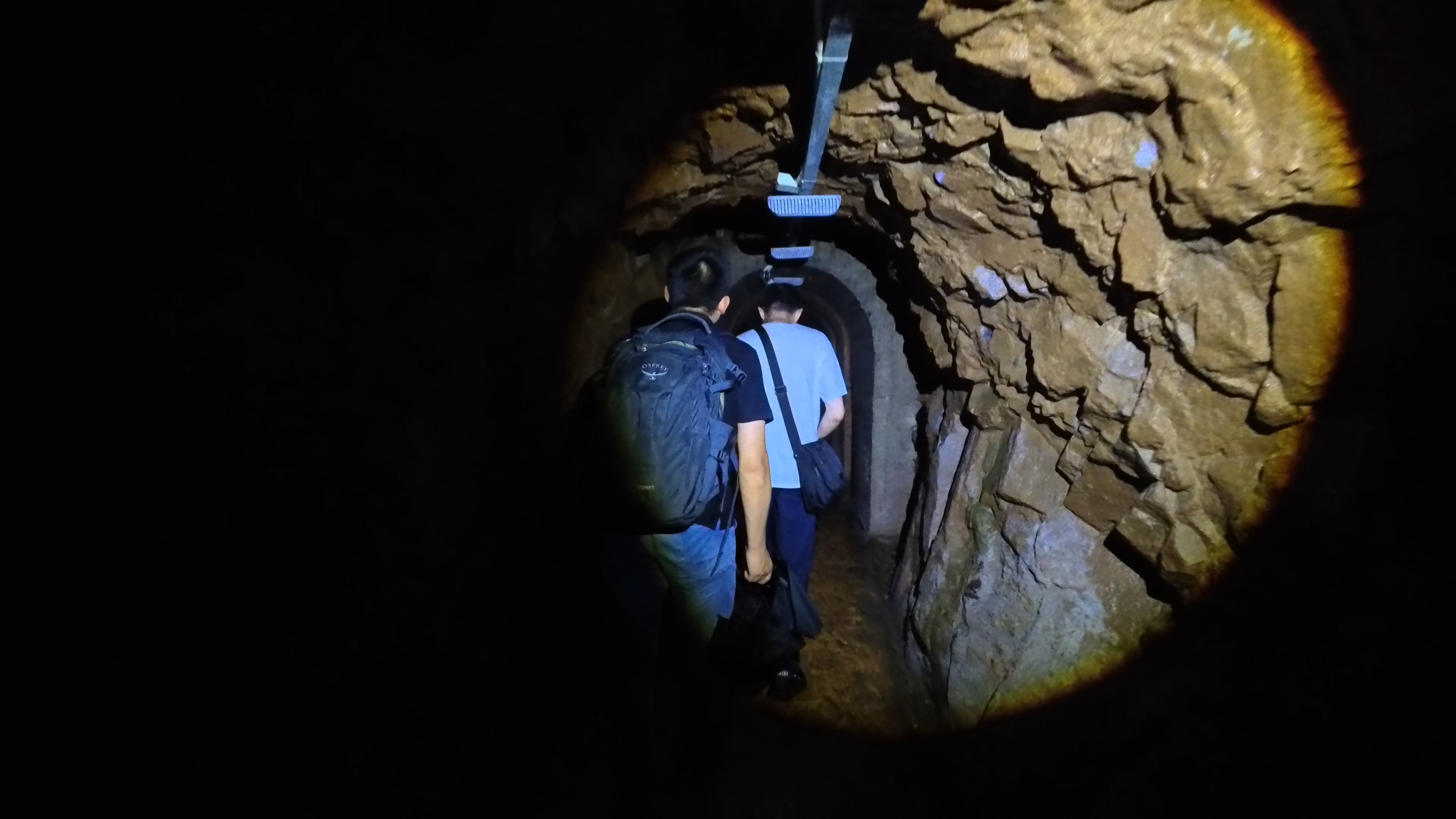 有失必有得,觀潮之後我們來到了豐義村,雖然只是一個採石留下的礦山,談不上海拔權當是個小土坡,但山間的清風鳥鳴和細雨,吹走了悶熱,洗去了疲憊,喚醒了親近山野的靈犀一動。但跟這些相比,更加激起我們興致的,是下山路上一起穿越貫徹山體的防空洞,一個開放遊覽的古早國防工程遺址。鑽山洞的樂趣實在難以名狀,像是走迷宮,又像捉迷藏,還像在金礦裏探寶,不知前方的黑暗中有什麼等待被揭開的謎題。