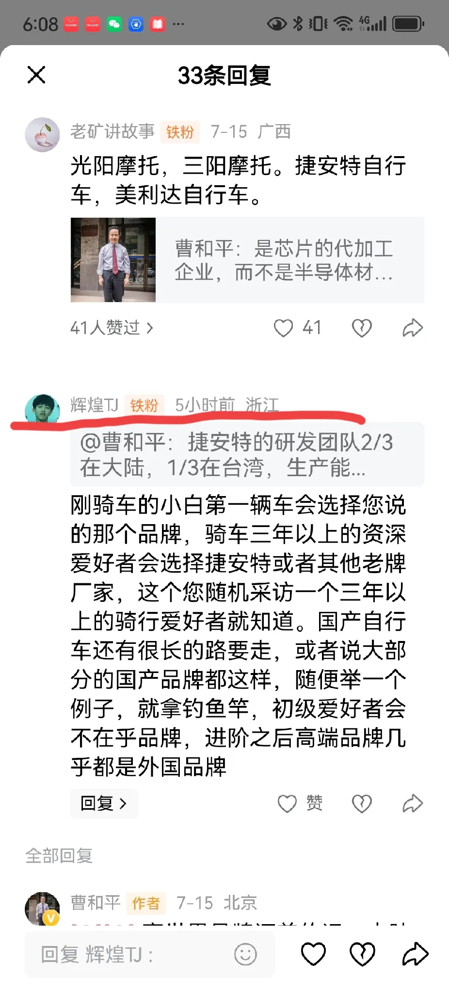 輝煌tj説:“剛騎車的小白第一輛車會選擇您説的那個品牌(指喜德盛),騎車三年以上的資深愛好者會選擇捷安特或者其他老牌廠家,這個您隨機採訪一個三年以上的騎行愛好者就知道。國產自行車還有很長的路要走,或者説大部分的國產品牌都這樣,隨便舉一個例子,就拿釣魚竿,初級愛好者會不在乎品牌,進階之後高端品牌幾乎都是外國品牌”。