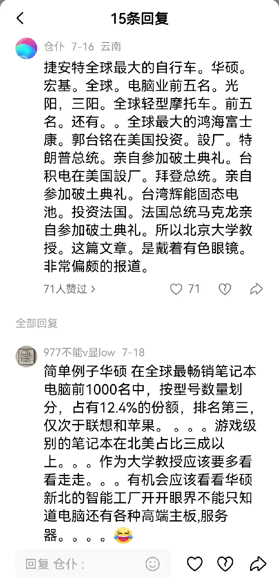 曹和平回答:“説真的,我不玩自行車,不知道你説的這個情況。我的討論是指的一個產業鏈的上下道工藝順序兩兩整合,達到閉洽程度的內生成長力矩。在這一點上,中國台灣的企業不如日、韓和大陸, 台灣的大廠商只做橫向整合(horizontal integration),比如,不在台灣本土做至少一個產業的縱向整合(Vertical integration)。