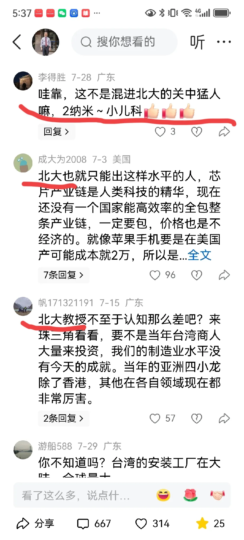我則指出了台積電本身是一家代工企業——早年的來料加工(代人勞動)的企業。這種企業本質業態上是一個車間,而不是完型廠商實體,不管你有多大,不管你用了啥工具來生產。 在行為上,代工企業(車間)往往爭的是年度協議,掐長(長期協議)丟短(中間品市場),從而把本土企業本來應該有的中間品市場羣建設給抑刮掉了(這不僅讓台灣的產業無根而且還讓他們在大陸建成的成十上百個物流園區無中間品市場羣序貫建設)。