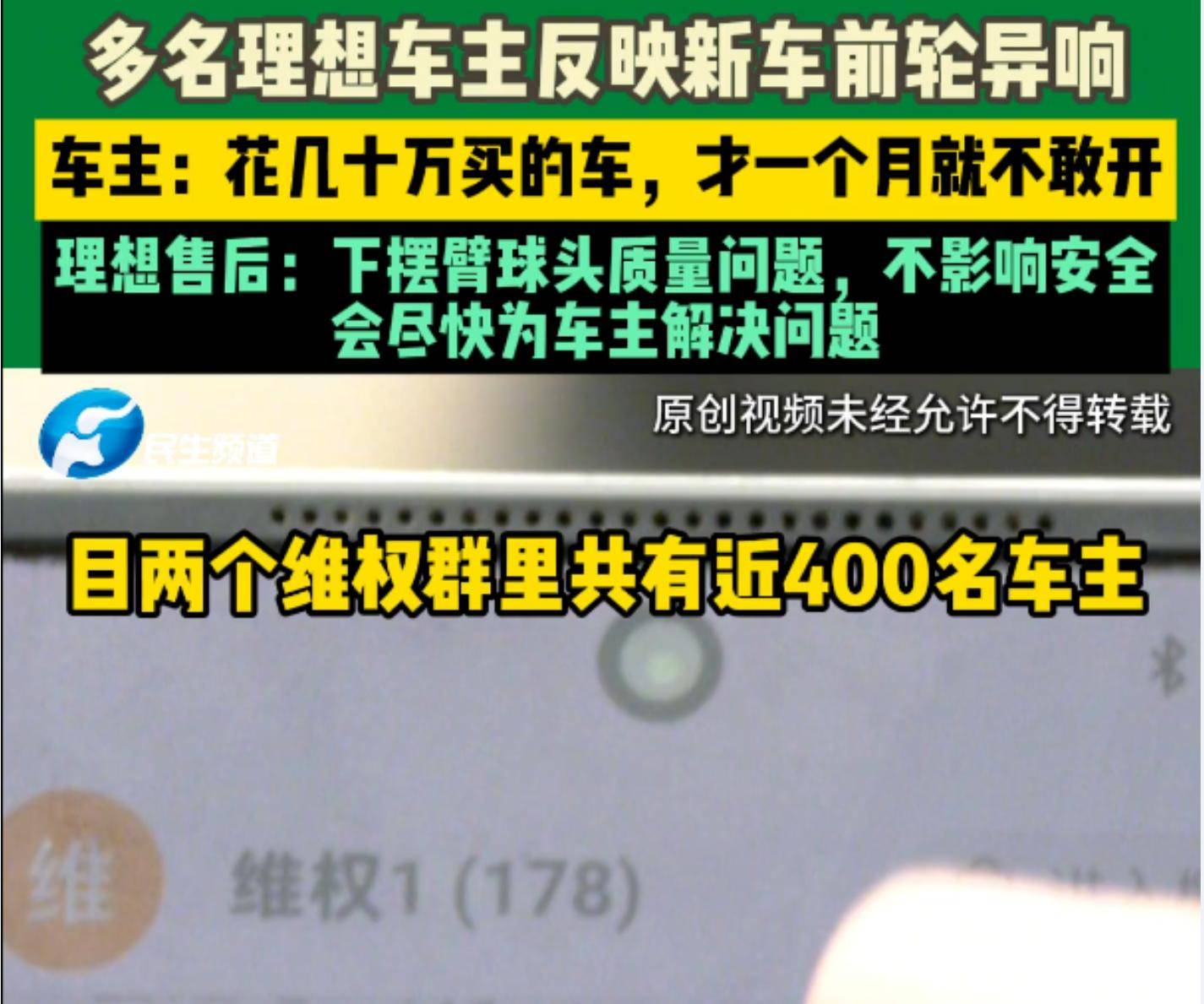 如果説高層減持是理想汽車內部問題的冰山一角,那麼質量問題頻發則是這座冰山顯露在水面上的巨大陰影。近期,理想汽車L系列車型被曝出存在嚴重的異響問題,尤其是前輪異響成為社交平台上的高頻詞。近四百名車主聯合建羣維權,控訴理想汽車的質量問題。