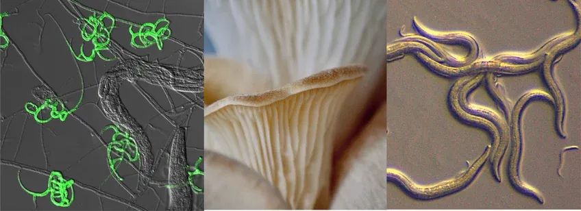 平菇是一種典型的食線蟲性真菌(Nematophagous)。食線蟲性真菌往往會產生揮發性化合物,模擬線蟲的性激素或者食物味道來誘捕線蟲,也會發育出各種捕食線蟲的裝置,如黏性結構或收縮環套來捕獵。