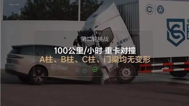 理想i8的質量連乘龍卡車的一半都不到,硬是正面接住了這100公里時速的兇猛撞擊。不但接住了,乘龍卡車的車頭還被頂翻了,車輪都離開地面,直接飛起來了。