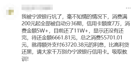 有網友自稱在不知情的情況下,寧波銀行信用卡消費滿200元起的,全被自動分期,信用卡額度7萬,自己花了5萬,結果利滾利,目前還了11萬元,還沒還完。