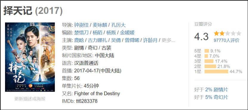 2015年播出的《盜墓筆記》,被吐槽選角不合適和五毛特效,豆瓣評分僅有5.6,依舊為愛奇藝狂攬500萬會員;《擇天記》的豆瓣評分更是低至4.3,但在2017年雲合數據年榜上,《擇天記》位列第三。