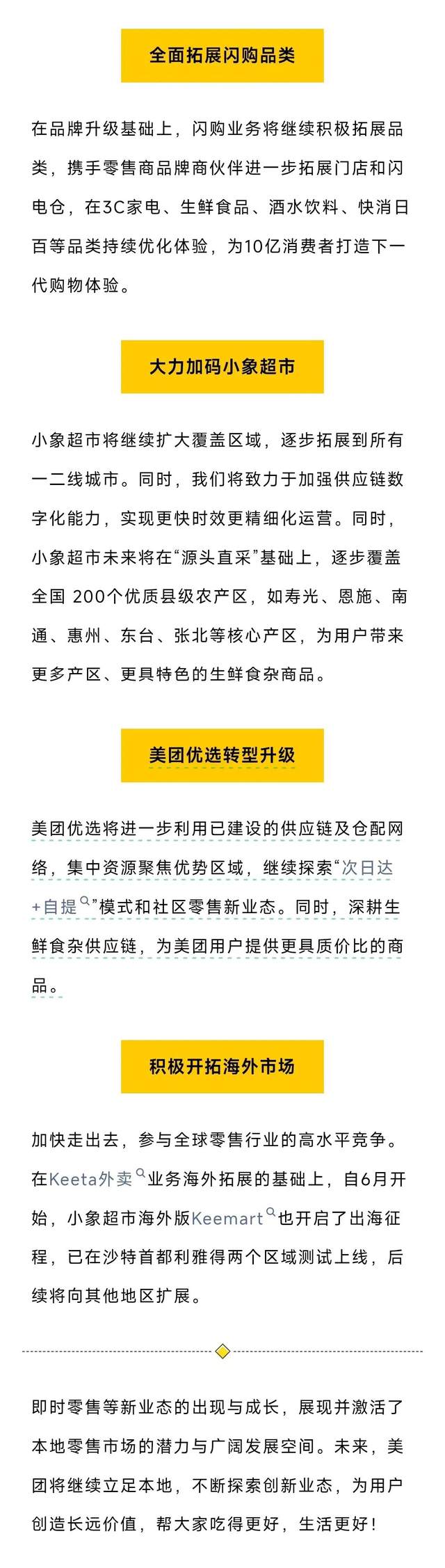 具體來看,美團將針對旗下美團閃購、小象超市、美團優選等業務模式進行調整升級:全面拓展閃購品類,為10億消費者打造下一代購物體驗;大力加碼小象超市,實現更快時效更精細化運營;美團優選轉型升級,繼續探索“次日達+自提”模式和社區零售新業態;積極開拓海外市場,參與全球零售行業的高水平競爭。
